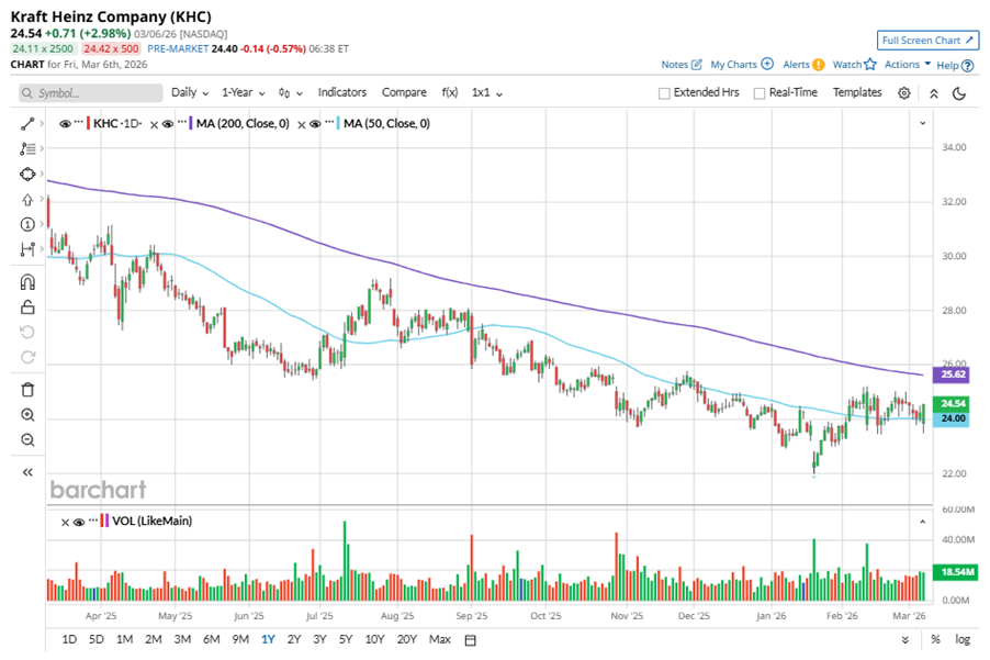 To confirm the bearish trend, KHC is trading below its 200-day moving average over the past year. However, the stock has been trading above its 50-day moving average since early February, experiencing slight fluctuations.