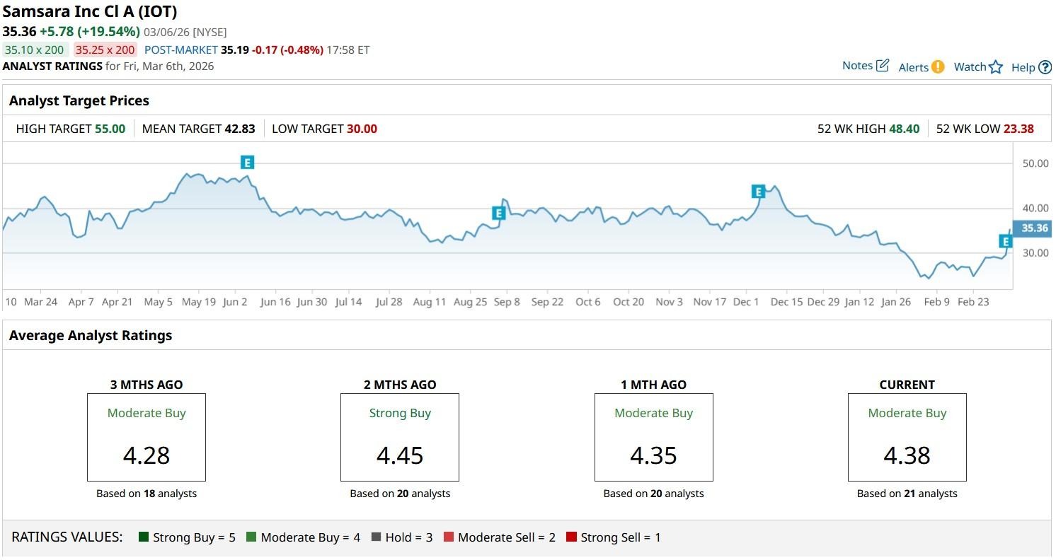 Other Wall Street firms are, therefore, keeping bullish on IOT shares as well. The consensus rating on Samsara sits at “Moderate Buy” currently, with the mean target of about $43.