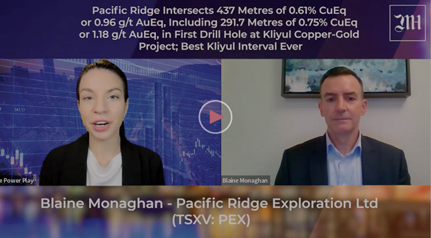 Pacific Ridge Exploration has announced assay results from the first of three diamond drill holes at the Kliyul copper-gold porphyry project. Drill hole KLI-21-036 highlights include 437.0 m of 0.61 per cent copper equivalent (CuEq) or 0.96 g/t gold equivalent (AuEq). Assay results from the remaining two drill holes, KLI-21-037 and KLI-21-038, will be reported when available. Blaine Monaghan, President and CEO of Pacific Ridge sat down with Caroline Egan to discuss the drill results.
