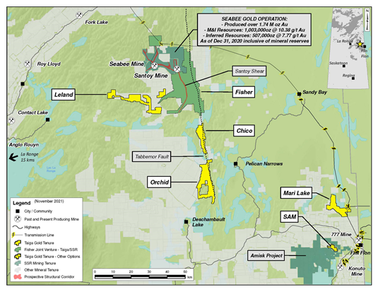 - Consolidates a 100% interest in the Fisher property contiguous to the Seabee mine, currently operated under joint venture comprised of SSR Mining (80%) and Taiga Gold (20%)