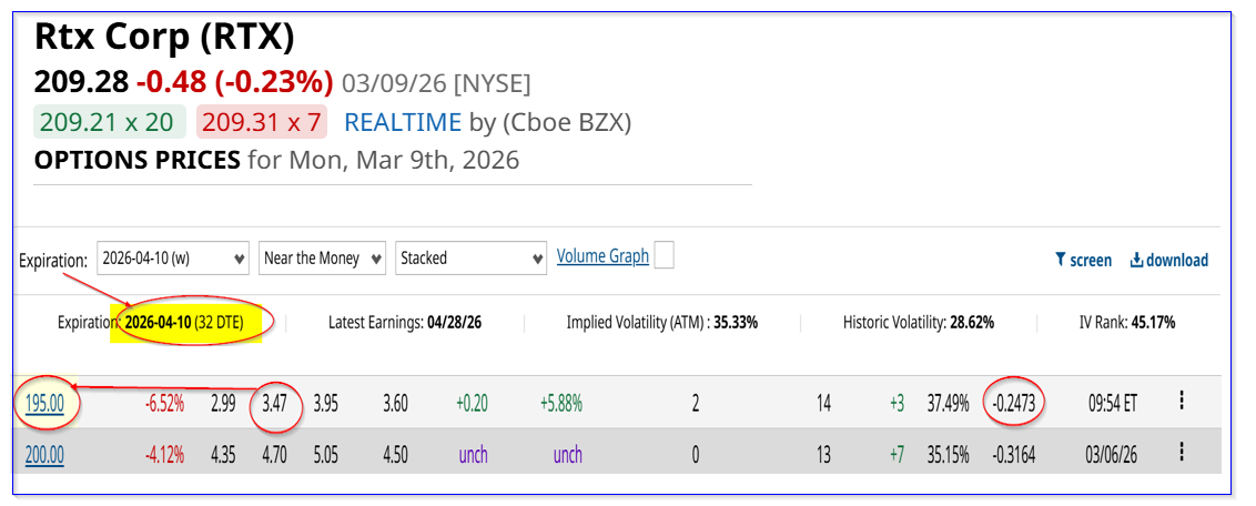 RTX is at $208.21 in midday trading on Monday, March 9, 2026. That's up from $195.98 on Feb. 25, a trough just before the Iran war started. As a result, its option premiums have risen, especially for one-month expiries. That makes them worth shorting.
