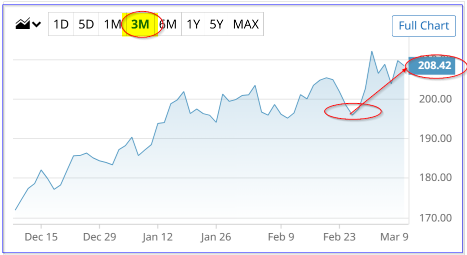 In addition, more risk-averse investors can sell short the $225.00 strike price call. That yield works out to about 1.5% (i.e., $3.09/$209.29 = 0.01476).