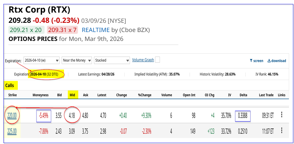 In other words, if you buy 100 RTX shares at $208.84, you can “Sell to Open” 1 call option contract at $220.00 and immediately receive $418.00 in your account. That works out to a one-money 2.0% yield.