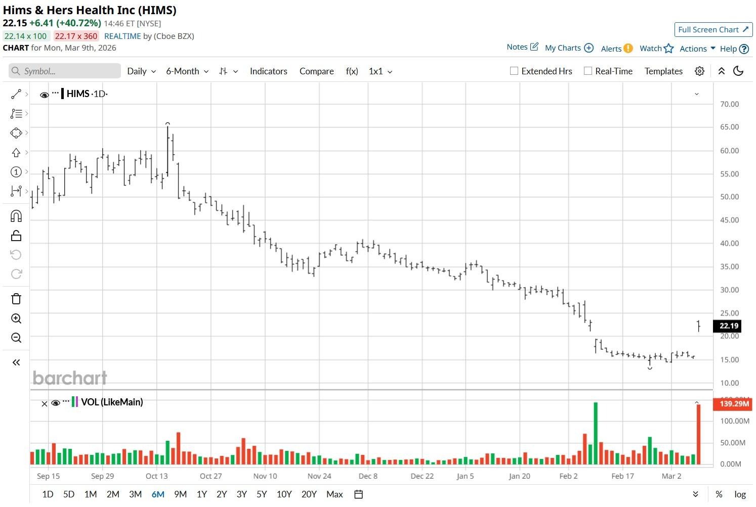 According to Barchart, the consensus rating on Hims & Hers Health sits at a “Hold," with the mean target of $21.60 indicating potential downside of about 3% from current levels.