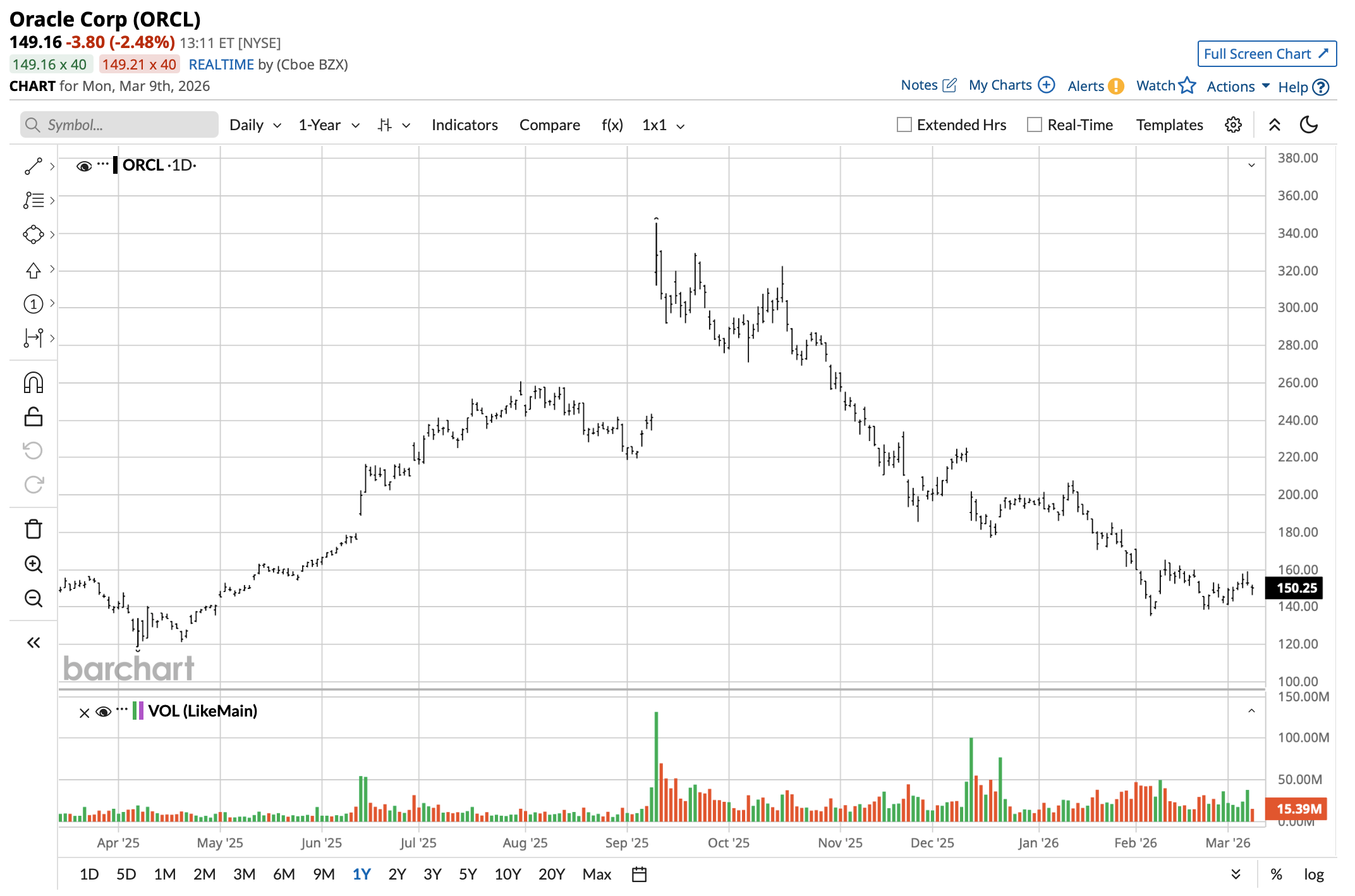 ORCL stock has been highly volatile over the last 12 months, trading between $118.86 and $345.72. Currently, shares trade at approximately $149.20. Oracle’s weighted alpha is -24.19x, which is indicative of a recent pullback, even as the S&P 500 Index ($SPX) has been stable over the same period.