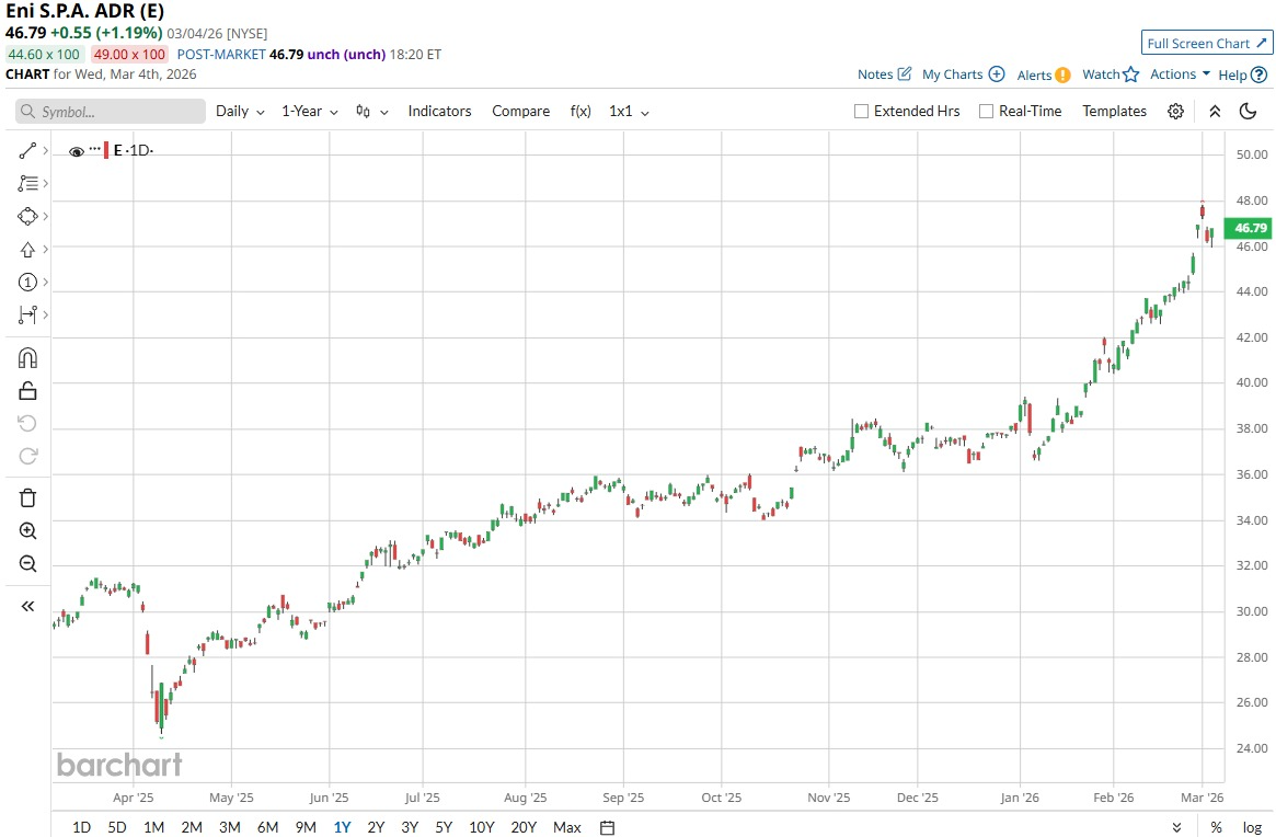 Eni trades near $46.79 with a year-to-date (YTD) gain of about 23.3% and a 52‑week advance of roughly 66.5%.