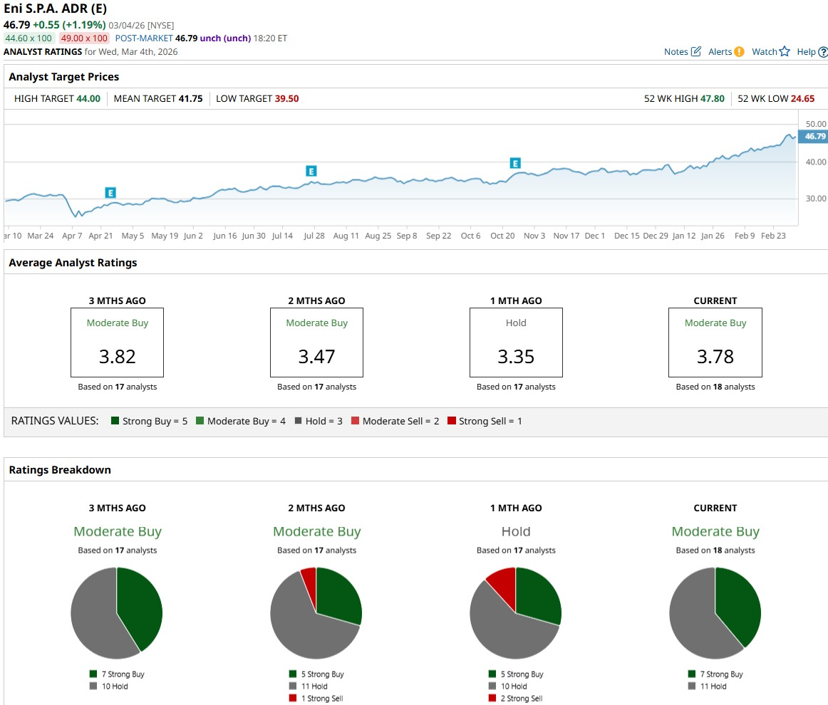 Eni currently carries a consensus “Moderate Buy” rating from 18 analysts, with a mean target price of $41.75 that implies roughly a 10.8% downside from its recent price.