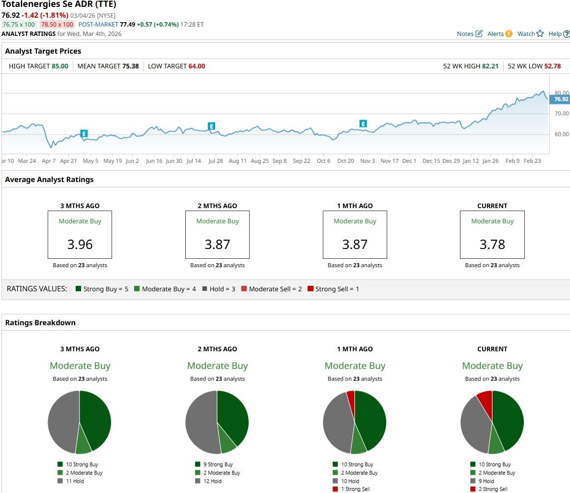 TotalEnergies currently holds a consensus “Moderate Buy” rating from 23 analysts, with a mean target price of $75.38 that implies roughly a 2% downside.