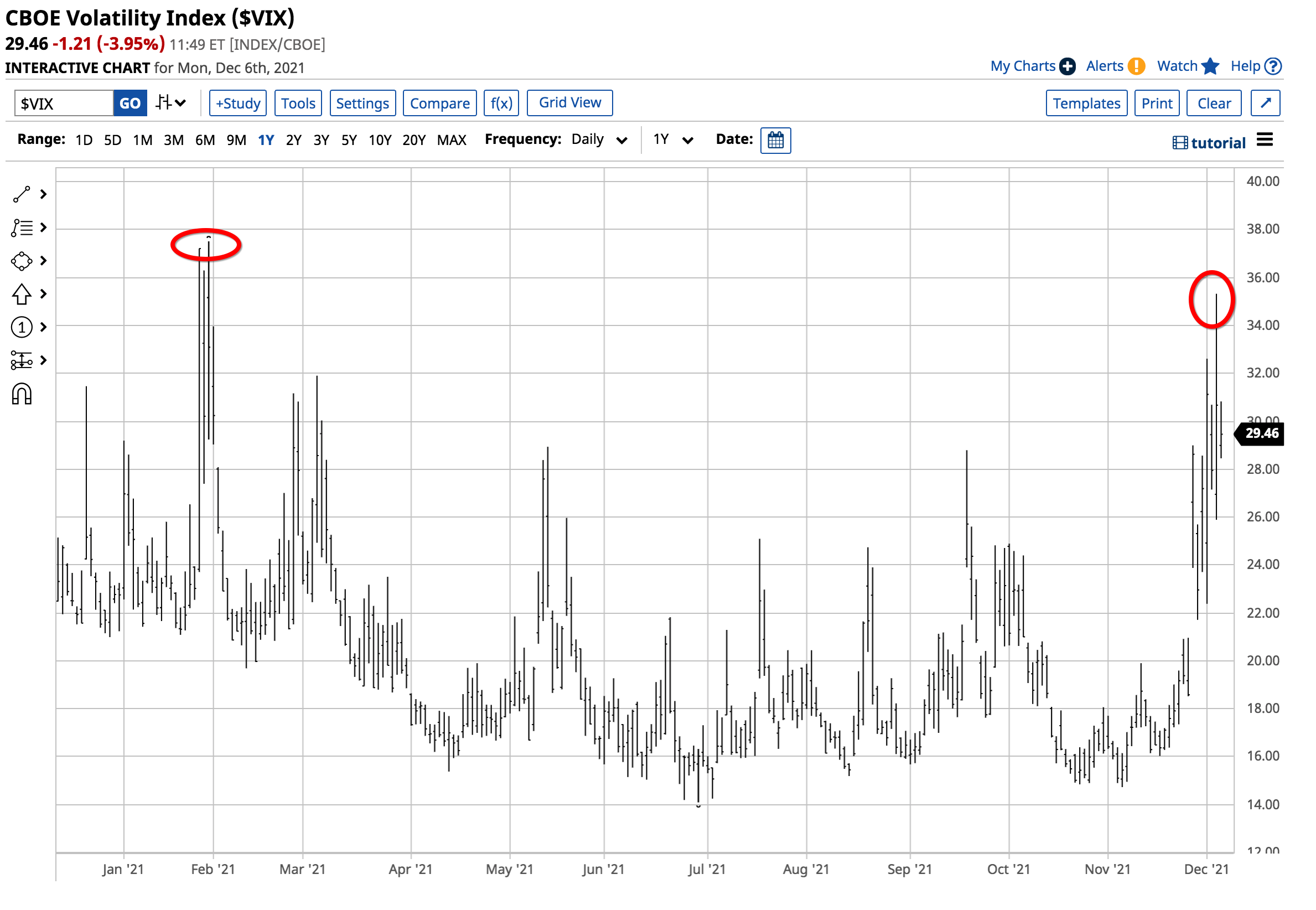 The chart of the VIX index shows the move to a high of 35.32 on December 3, the highest level since the week of January 29, 2021. The high in the VIX in 2021 was at 37.51 during the week.