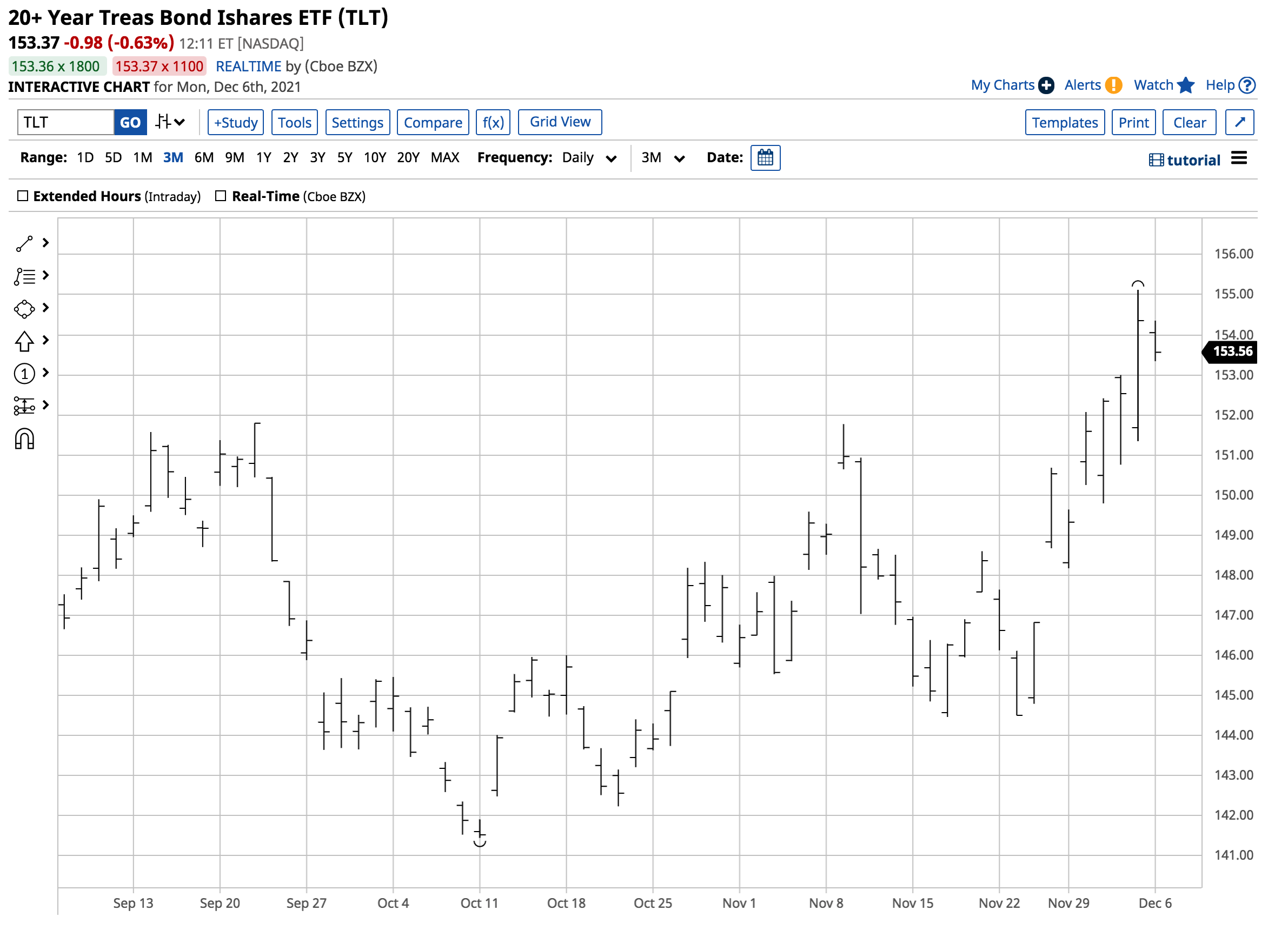 The chart shows the rise from $141.45 on October 11 to $155.12 on December 3, a 9.66% increase in the ETF tied to Treasury bond prices.