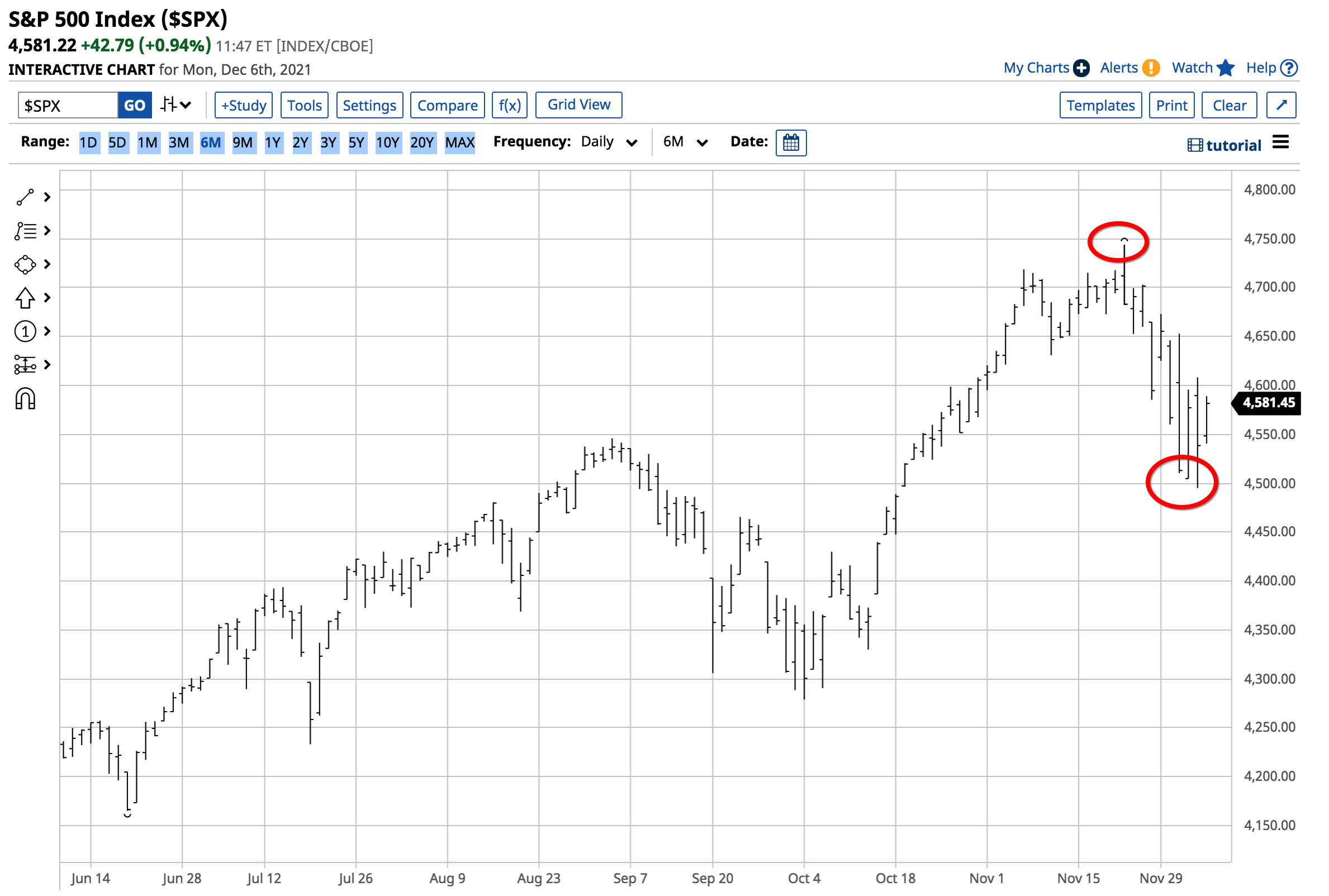 The chart illustrates the decline to a low of 4,495.12 on December 3, a 5.24% correction. The index that reflects a broad range of US stocks closed at the $4,538.43 level on December 3, not far above the December 3 low.