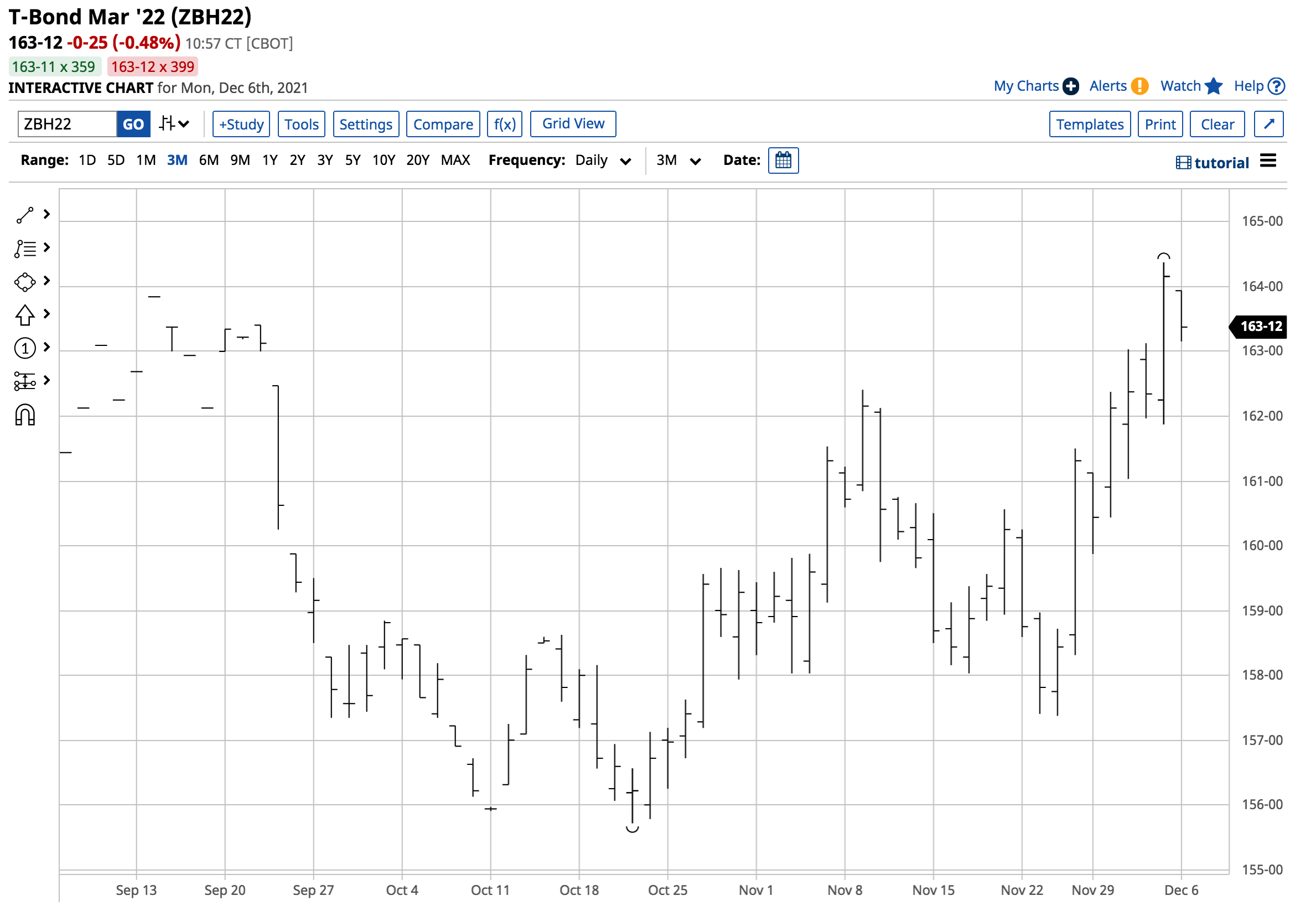 The chart of the March US 30-Year Treasury bond futures shows the rise from a low of 155-23 on October 21 when inflationary fears peaked to a high of 164-12 on December 3 as the stock market fell and market participants sought safety in bonds.
