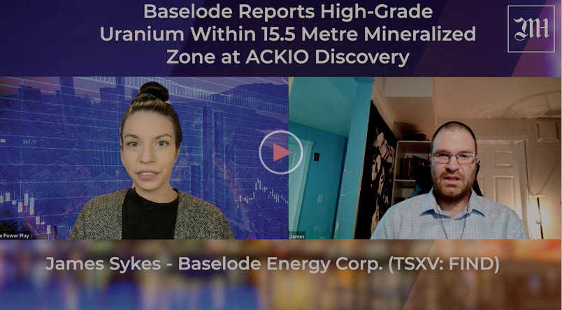 Baselode Energy has reported Uranium assay results from the first diamond drill hole of the recent ACKIO Uranium discovery on the Hook project. The ACKIO discovery has revealed high-grade uranium near-surface, widespread zones of mineralization and an alteration halo that exceeds over 230 metres. Primary mineralized zone measuring 15.5 m of 0.13 wt per cent U3O8. Assay results from the remaining drill holes completed on ACKIO in the summer program will be released after they've all been received. James Sykes, CEO, President and Director of Baselode shared the exciting results with Caroline Egan.