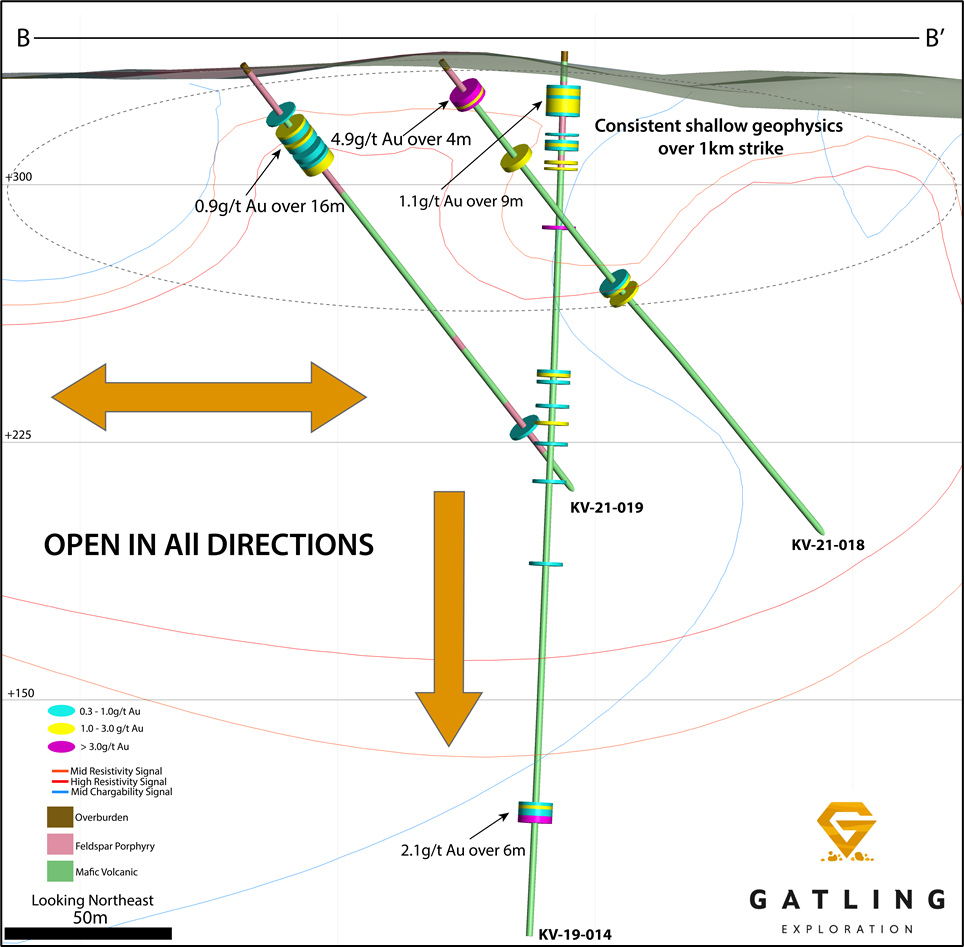 Jason Billan, President and CEO for Gatling, commented, "The results of the recently completed 5,000 meter drill program have completely redefined the gold potential of the Kir Vit Prospect at the Larder Gold Project. Initial drilling at Kir Vit outlined promising near-surface gold intercepts near syenitic intrusions and shear-hosted structures in mafic volcanic rocks. The Phase II drilling was partially designed to probe a large, 1 km long by 600 m wide, package of Timiskaming Conglomerates containing hydrothermal breccia structures. The drill intersections in the shear structures yielded high-grade over shorter intervals, while hole KV-21-30 in the conglomerate zone suggests that Kir Vit has more to offer by exhibiting much larger widespread zones than recently discovered. This new mineralized unit, still heavily unexplored, is volumetrically large and will be the focus of our Phase III 2022 drilling at the Kir Vit prospect. We will be outlining our comprehensive exploration budget and program at the Larder Gold Project in early 2022."