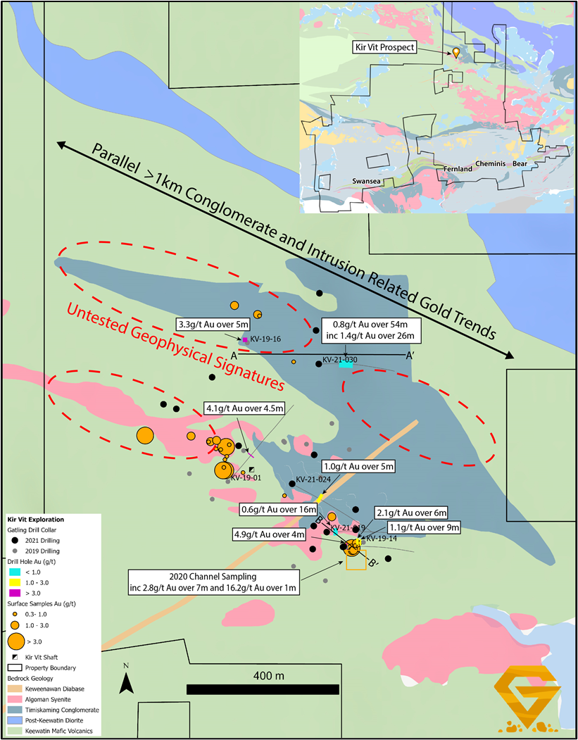 - Near Surface Gold Mineralization within the Timiskaming Conglomerate opens northern part of Kir Vit. KV-19-016 and KV-21-030 have each intersected conglomerate-hosted gold mineralization at a 300 m step out. With a strike of over 1 km and a width of 600 m at surface, the Timiskaming conglomerate is a promising target of future exploration (Figure 1). Infill drilling to connect the two holes, utilizing similar geophysical signatures, and further extension of the mineralized footprint within the conglomerate is planned for Phase III.