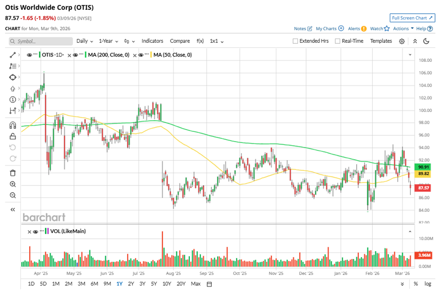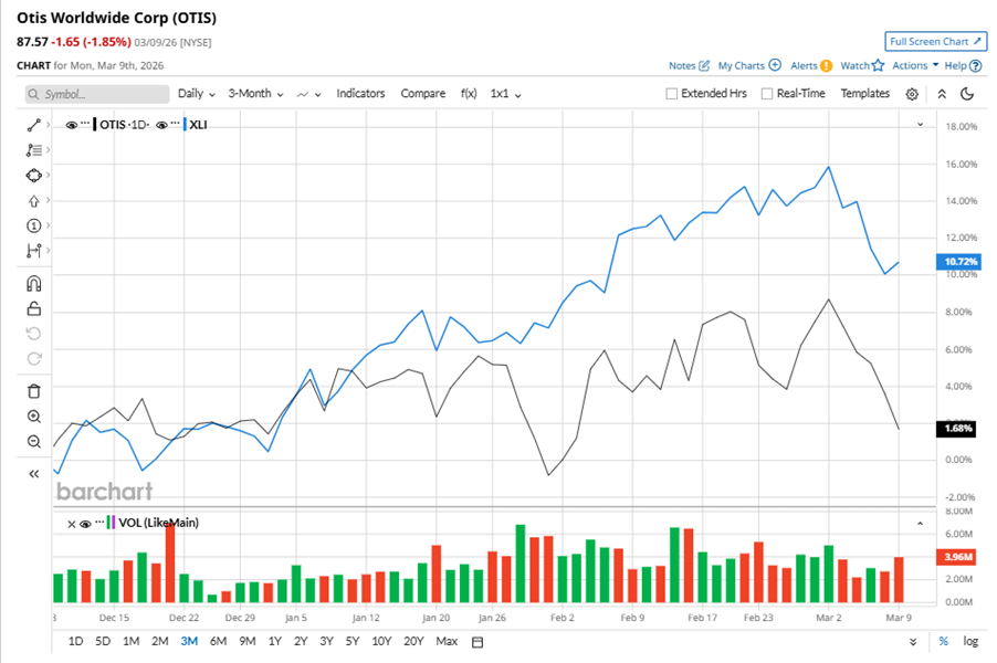 Despite its notable strength, OTIS slipped 18% from its 52-week high of $106.83, achieved on Mar. 10, 2025. Over the past three months, OTIS stock gained marginally, underperforming the Industrial Select Sector SPDR Fund’s (XLI) 11.5% gains during the same time frame.