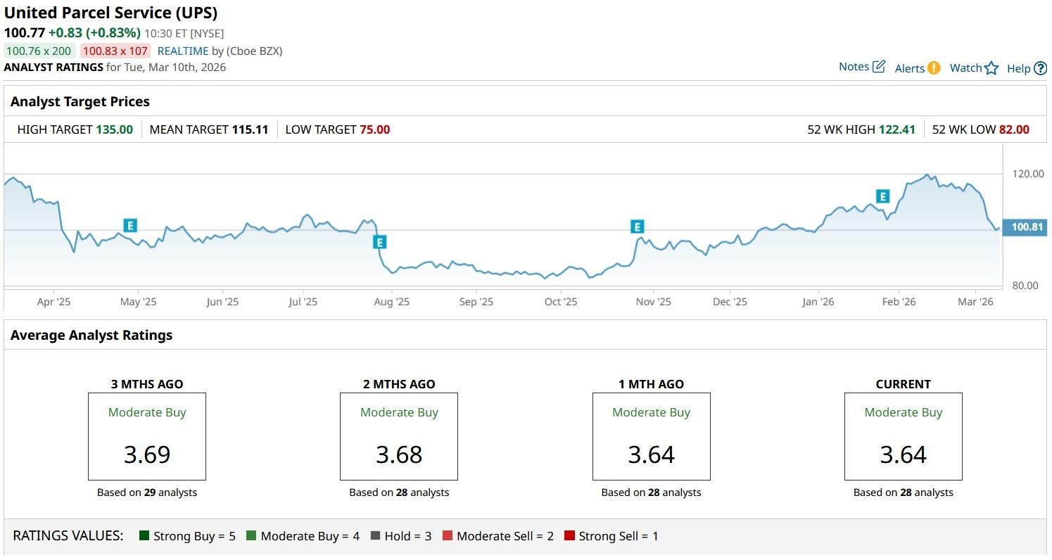 The consensus rating on United Parcel Service sits at “Moderate Buy” currently, with the mean price target of about $115 suggesting potential upside of roughly 15% from here.