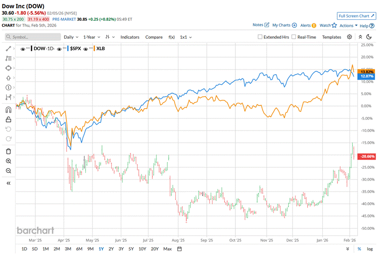 Shares of Dow have underperformed the broader market over the past year but have rallied in 2026. DOW stock has declined 19.4% over the past 52 weeks and has surged 30.9% on a YTD basis. In comparison, the S&P 500 Index ($SPX) has returned 12.2% over the past year and declined marginally in 2026.