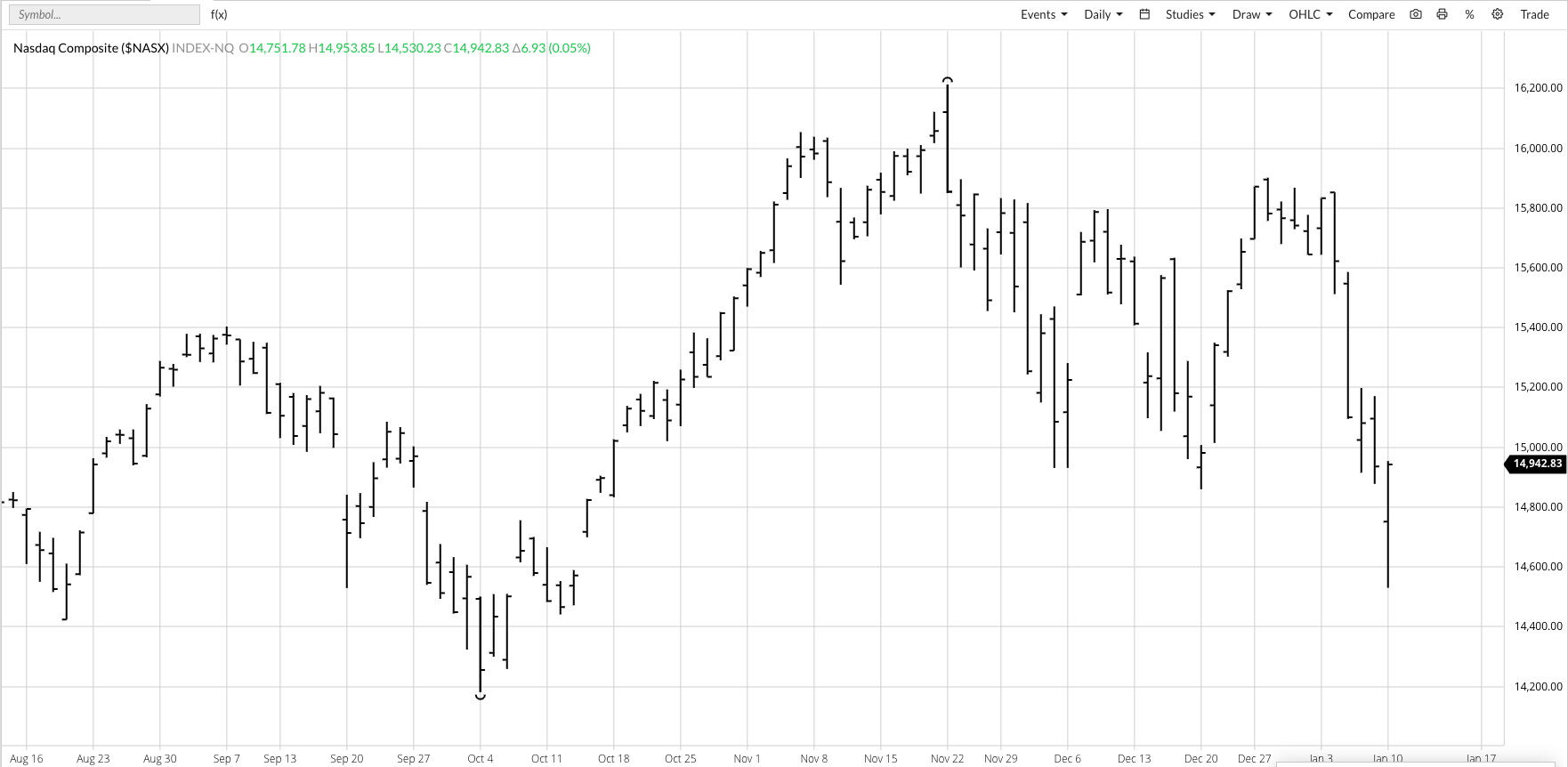 There was a great deal of hand wringing and gnashing of teeth over the course of Monday’s session for US stock indexes. The Big 3 (S&P 500, Dow, and Nasdaq) had closed lower the previous four days, with sellers getting more aggressive last week. The S&P ($INX) had slipped 2.5% from Tuesday through Friday, the Dow ($DOWI) dropped 1.5 during that same time, and the Nasdaq ($NASX) had nosedived 6% from Monday’s close through Friday’s settlement. It was a rough week, leading television talking heads to bemoan the hawkish attitude of the US Federal Reserve in the minutes of its December meeting. Coverage escalated the blame by basically saying it was the Fed’s job to make sure investors feel good and stock markets remain bullish. My thought on this? Hogwash. The Fed’s job is to set monetary policy for the economy at larger, and unlike some past presidents’ belief, stock markets are not the economy.