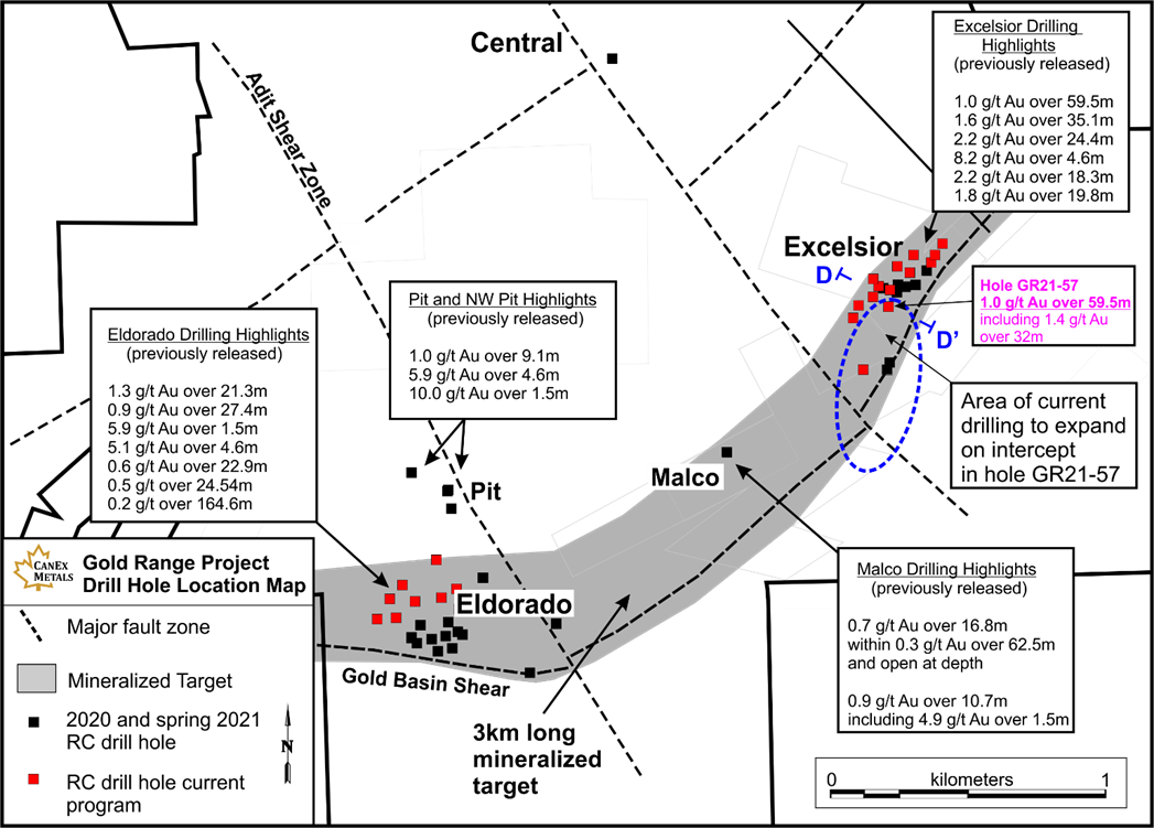 CALGARY, AB / ACCESSWIRE / January 13, 2022 / CANEX Metals Inc. (TSXV:CANX.VN)(OTCPINK:NOMNF)(FRA:NJM1) ("CANEX" or the "Company") is pleased to announce that reverse circulation drilling has resumed at the Gold Range Project, Arizona, after a scheduled holiday break. The drill is set up at the Excelsior Zone where several new holes have been added to the program to delineate the mineralized zone encountered in hole GR21-57, which intersected 1.0 g/t gold over 59.45 metres starting from surface and ending in mineralization (previously released see December 16, 2021 news release). Hole GR21-57 intersected the longest continuous zone of mineralization encountered at Gold Range to date and represents a compelling target for the Company
