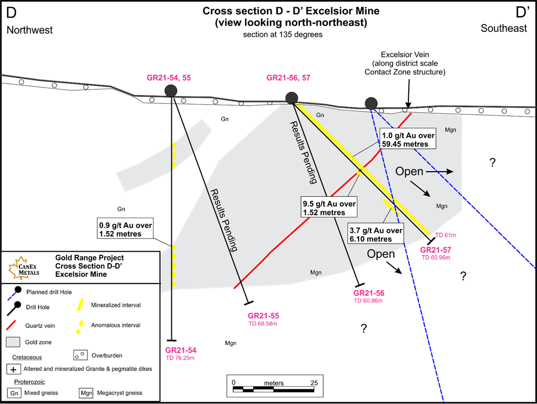 Dr. Shane Ebert, President of the Company stated, "We are excited to resume drilling at Gold Range and will initially focus on expanding the wide mineralized intercept encountered in hole GR21-57 with 8 or 9 additional holes. Hole GR21-57 was basically mineralized from top to bottom and the mineralized zone at Excelsior could be getting significantly wider toward the south, where the zone approaches a key structural intersection which conceptually is a great target for larger and/or higher-grade zones of mineralization. The southern projection of the zone is within a flat covered area that has not been systematically tested previously".