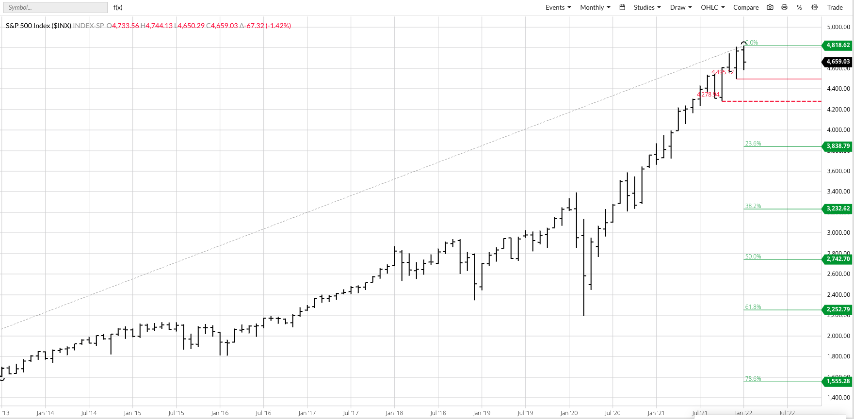 Starting with the S&P 500, the index extended its major (long-term) uptrend to a high of 4,818.62 on January 4. However, since then the $INX has been losing ground, falling to a low of 4,582.24 on January 10 before closing this week at 4,662.85. On its monthly chart the index is in position to post any one of the three bearish technical reversals I look for: