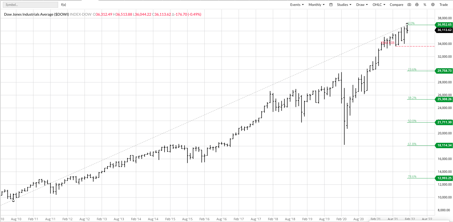 We’ve reached the midpoint of January, and there is a consistency showing up on the long-term monthly charts[i] for the three major US stock market indices: the S&P 500 ($INX), Dow Jones Industrial Average ($DOWI), and Nasdaq ($NASX). To begin with the conclusion, like a stopped watch, those who have been bearish US stocks may finally be correct.