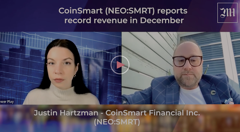 CoinSmart Financial (SMRT) has announced a record preliminary unaudited monthly revenue in December 2021 of approximately $2.15 million. This represents a 460 per cent increase in revenue compared to December 2020. CoinSmart CEO Justin Hartzman sat down with Caroline Egan to discuss the company's success and plans moving forward.