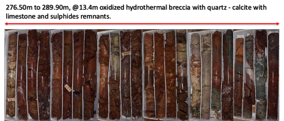 Before intercepting the targeted Santa Maria Structure at depth, the previously newly discovered mineralized hydrothermal breccia was intersected once again, in this case from 276.50 - 289.90 meters. See Photo 1, Figure 2 and Table 1 below.