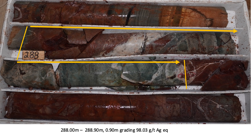 The lower contact of the breccia zone from 288.00 - 288.90 reported 98.03 g/t Ag Eq, See Photo 2, Figure 2 and Table 1 below.