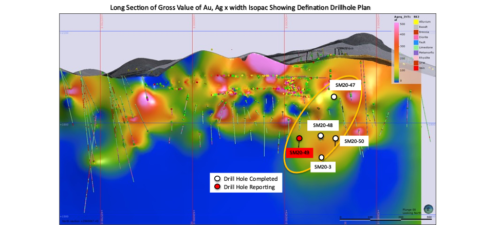 Peter J. Hawley, CEO and President, remarks, "As you can see below, planned definition hole SM20-49 was designed to fill in a drill poor gap in the past resource area and to follow the down dip mineralized plunge intercepted in drill holes SM20-47 and 48. Previously reported hole SM20-47 reported a broad zone of 13.10 meters grading 98.31 g/t Ag Eq with numerous higher-grade intercepts within, while hole SM20-48 returned 110.81 g/t Ag Eq over 24.50 meters. See Figure 1 below.