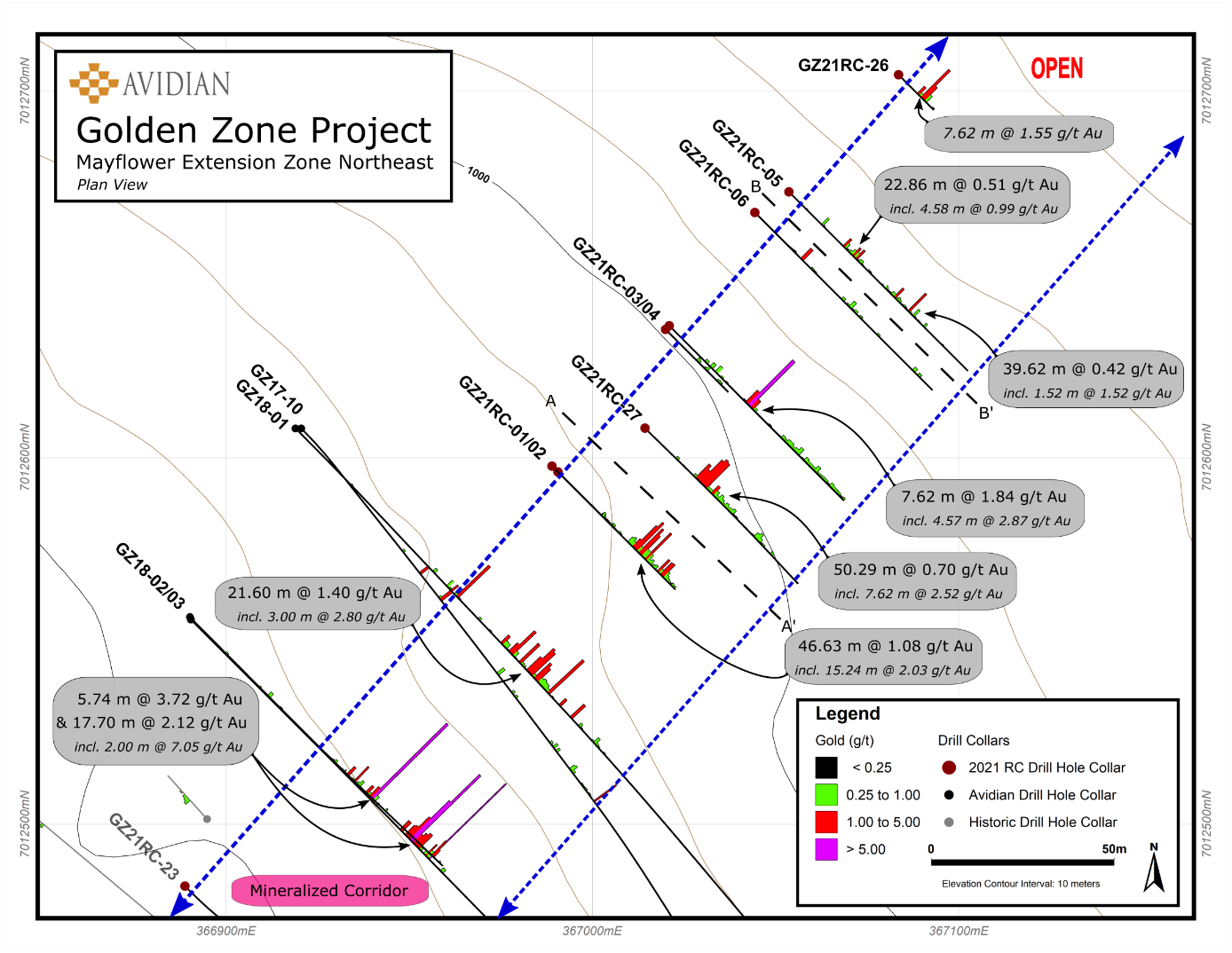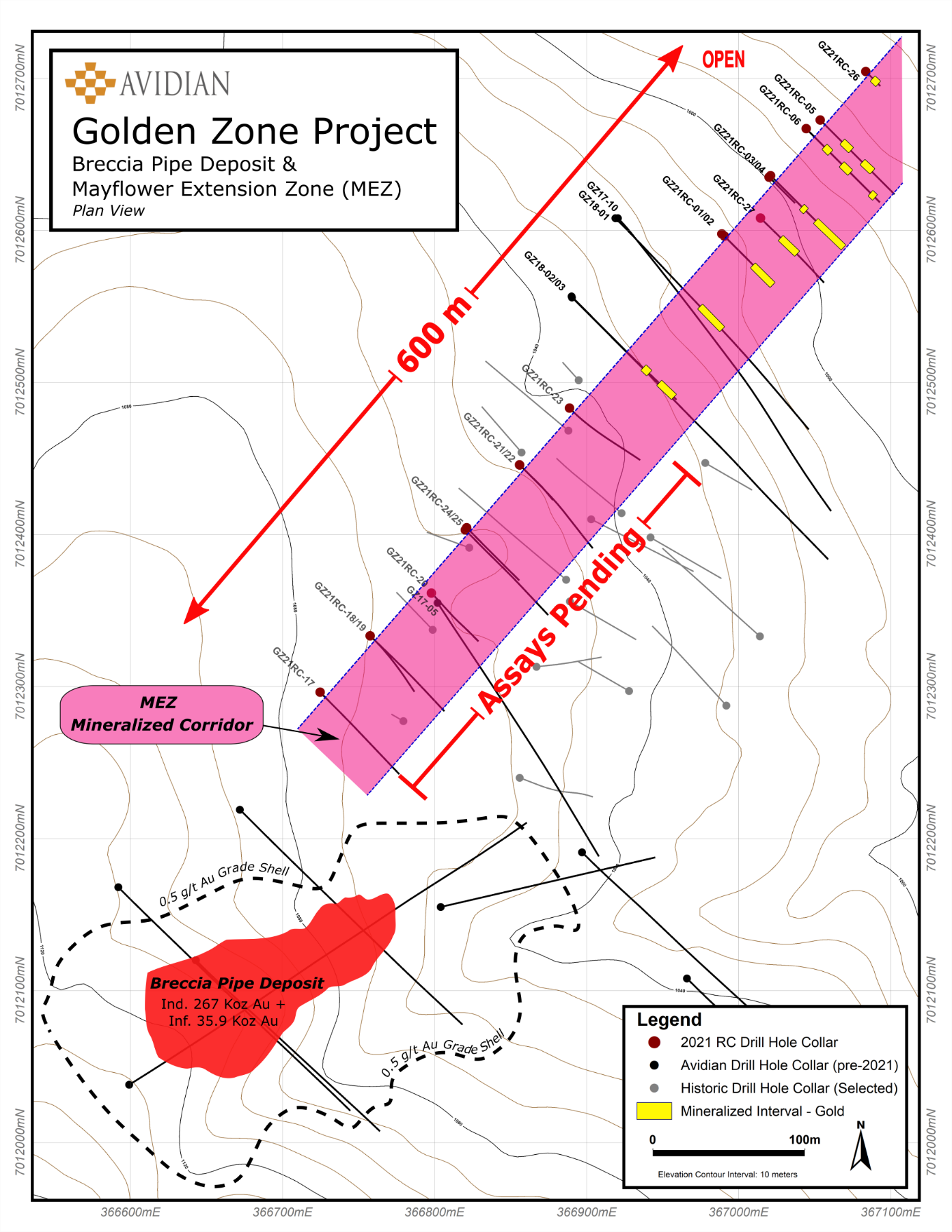 Steve Roebuck, President & CEO states: "We are extremely pleased with the success of the 2021 drill campaign at MEZ. The results received to date demonstrate the high potential for the continued discovery of near-surface gold mineralization peripheral to the Breccia Pipe Deposit. The drill program tested shallow gold mineralization along a 600 m strike length and confirms that mineralization remains open along strike and at depth. We are also encouraged that many of the holes intersected multiple mineralized zones, and two holes including our longest intersection inGZ21RC-02, ended in gold mineralization. The consistency of the structural setting along northeast trends at the MEZ and the associated replacement style of mineralization continues to drive our exploration efforts."