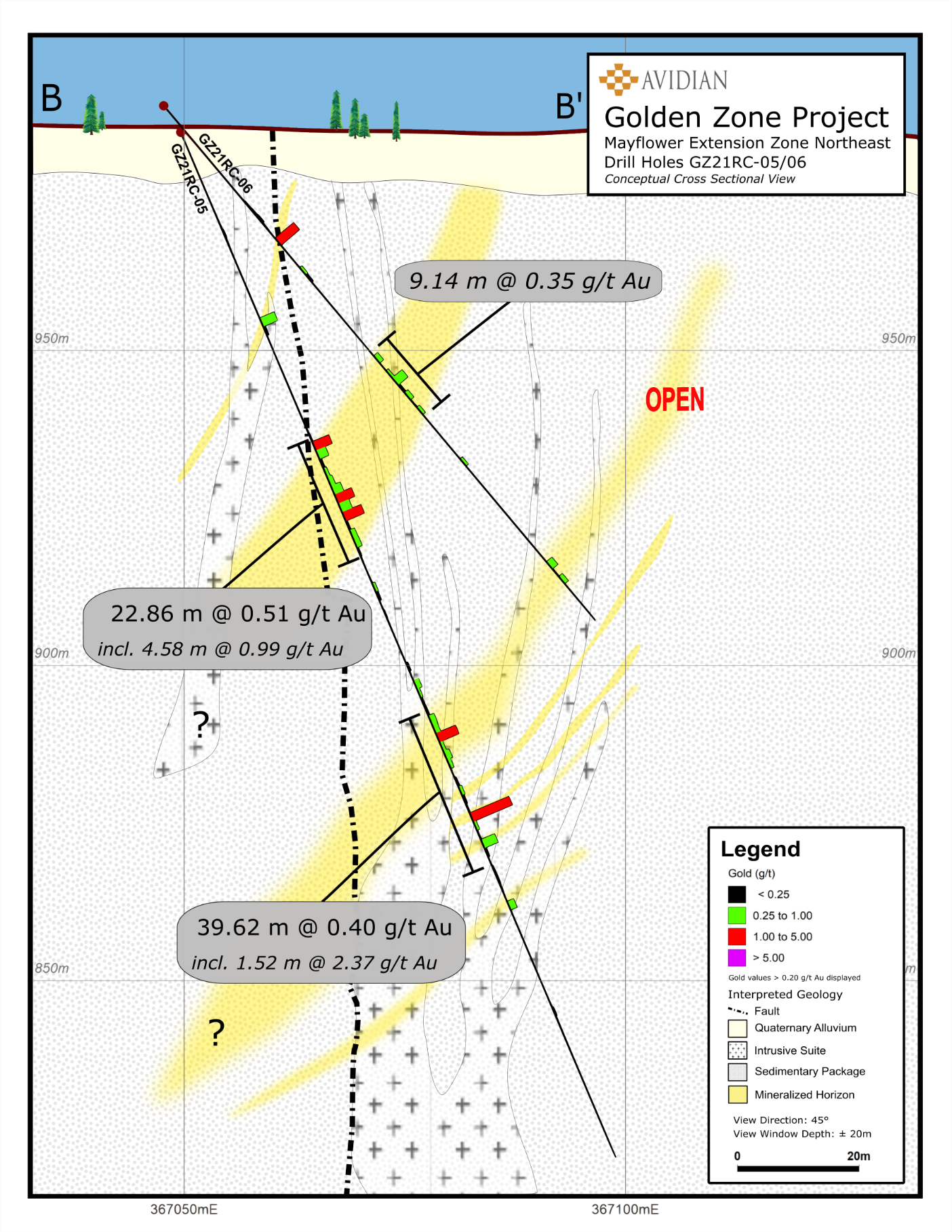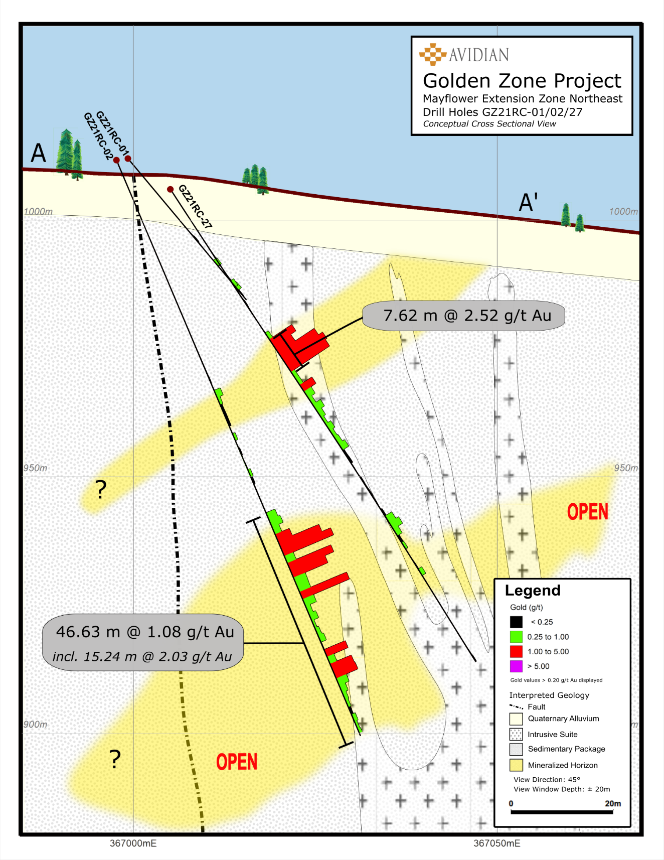 Hole GZ21RC-26 was the northeasternmost hole drilled in the MEZ to date, successfully extending the zone an additional 185 m past previous drill holes GZ17-10 and GZ18-01. Even though hole GZ21RC-26 was terminated well short of its targeted depth, it unexpectedly intersected a zone grading 7.62 m @ 1.55 g/t Au and 13.44 g/t Ag including a 3.05 m @ 2.7 g/t Au. This mineralized interval contains 70% quartz veining, 20% arsenopyrite, and 2% pyrite hosted within a >15.24 m quartz-feldspar porphyry dike (hole terminated in the dike). This hole provides Avidian with the justification to continue our expansion drilling and exploration efforts to the northeast and test for a possible new mineralized horizon both along strike and at depth.