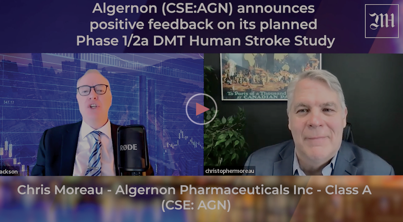 Algernon (AGN) has filed a Clinical Trials of Investigational Medicinal Products and Ethics Approval application with the UK Medicines and Healthcare Products Regulatory Agency (MHRA). The primary focus of the Phase 1 DMT study is to investigate prolonged intravenous infusion of DMT helping Algernon plan its Phase 2 study more effectively. Christopher J. Moreau CEO of Algernon Pharmaceuticals sat down with Dave Jackson to discuss the news.