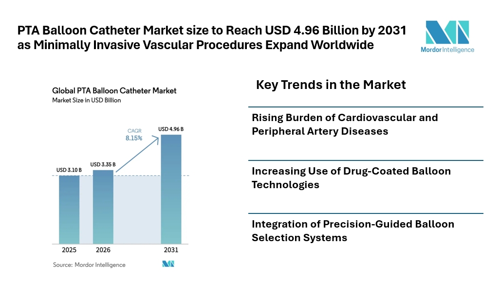 According to Mordor Intelligence, the pta balloon catheter market size is estimated at USD 3.10 billion in 2025 and is projected to reach USD 3.35 billion in 2026, eventually expanding to USD 4.96 billion by 2031. The pta balloon catheter market forecast indicates steady expansion driven by the rising global burden of vascular diseases and wider use of minimally invasive procedures in cardiovascular care.