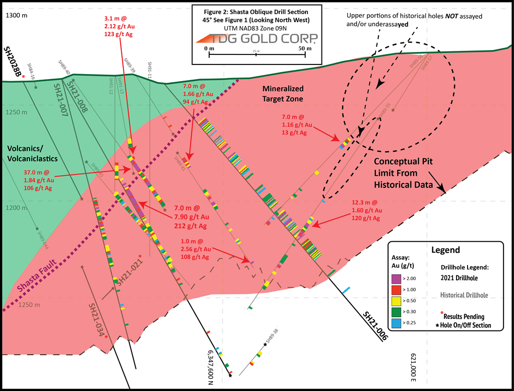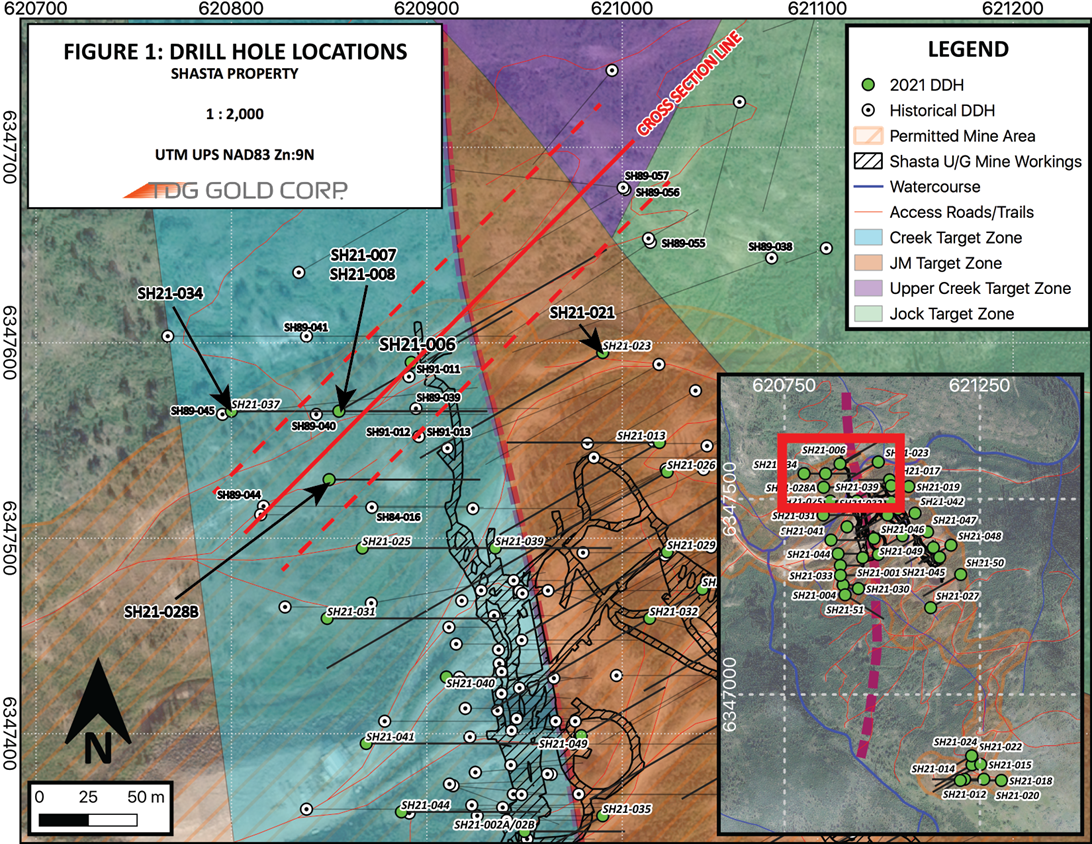 As with TDG's recently published drillholes from the 2021 Shasta drill program (see TDG news releases January 04, 2022 and January 11, 2022), drillhole SH21-006 demonstrates continuity of grade and mineralization along with confirmation of grades of the surrounding historical holes and validation of the expected dimensions of mineralized zone in that section of Shasta (Figure 1). An oblique cross-section is presented in this news release that spans the Creek, JM and Upper Creek Zones (Figure 3).