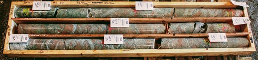Drillhole SH21-006 intersected variably silicified, potassic-altered volcaniclastic rocks below the Shasta Fault (at 17.4 m) that carried a mineralized assemblage of dominantly pyrite and acanthite associated with quartz-carbonate veins, composite vein sets and breccias. Sulphide mineralization was identified as disseminated throughout and vein-vein selvage hosted Figure 2 presents the style and grade of typical mineralization encountered.