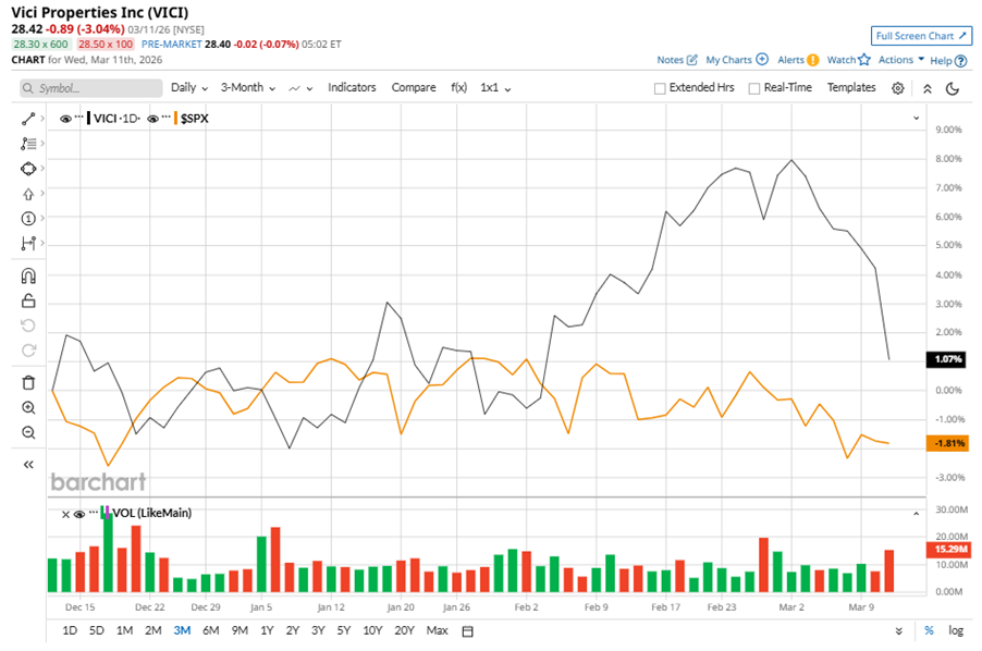 Despite its notable strength, VICI slipped 16.4% from its 52-week high of $34.01, achieved on Aug. 5, 2025. Over the past three months, VICI stock gained 1.1%, outperforming the S&P 500 Index’s ($SPX) 1.8% decline during the same time frame.