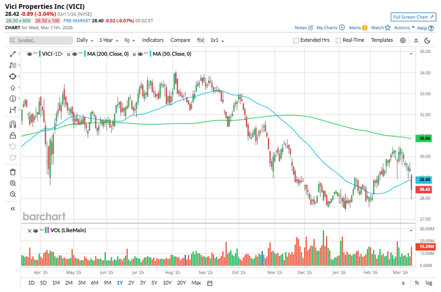 To confirm the bearish trend, VICI is trading below its 50-day moving average recently. The stock has been trading below its 200-day moving average since early October, 2025.