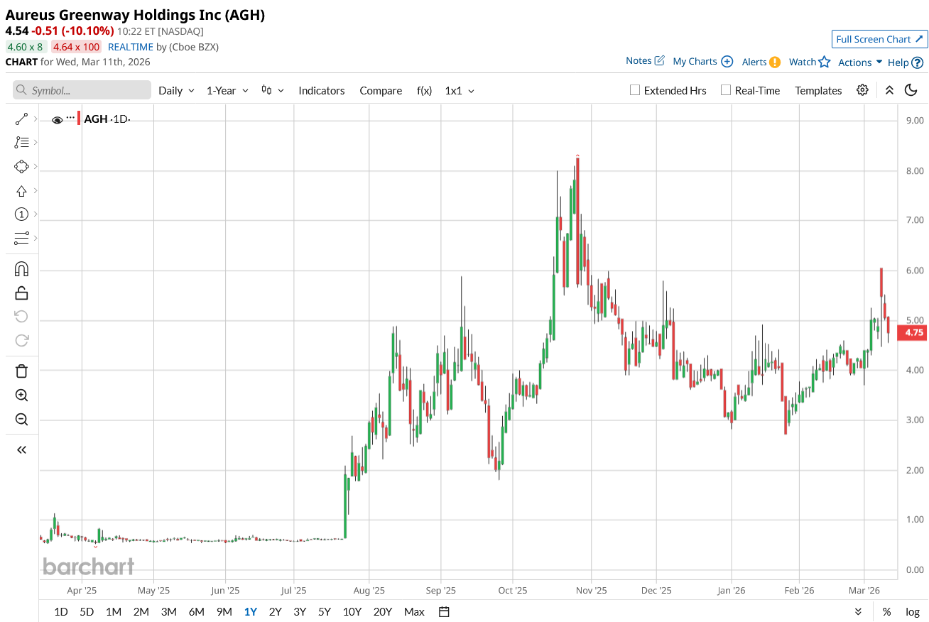 AGH trades at $4.54 as of March 11, up 48% year-to-date (YTD) and 555% over the past 52 weeks.