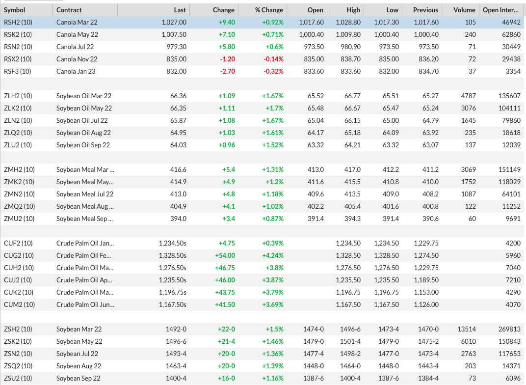 We see a similar price relationship in soybean meal where the forward curve is generally inverted from March 2022 through December 2024. Given Argentina is the world’s largest soybean meal exporter, this speaks volumes about the commercial side’s opinion of Argentine production this year due to drought. Not to be outdone, soybean oil’s forward curve is also inverted from March 2022 through December 2024. At last week’s meeting I was also part of a panel discussion regarding renewable diesel in the US, a program expected to create a demand market (new demand pulling on steady to growing supplies, resulting in a long-term price change) in soybean oil. Canola is also fundamentally bullish long-term, again indicated by the market’s inverted forward curve from March 2022 through March 2024. Here we see my idea oilseed futures at their core are weather derivatives, with continued drought over the Canadian Plains the key factor.Â