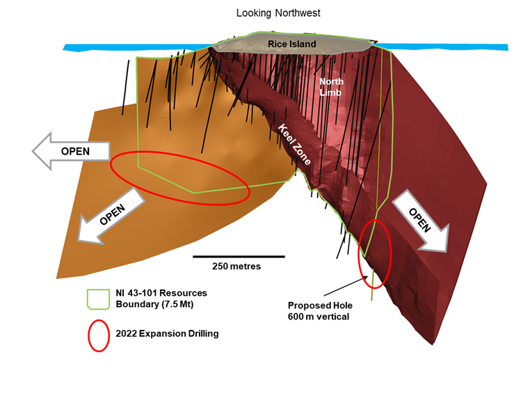 - Testing the Keel of the Rice Island Deposit with a significant, 150 metre down plunge, step-out to the known deposit into an area of no previous drill data. This hole is expected to be close to 700 metres long and should intersect the modeled base of the Keel Zone at approximately 600 metres below the surface (Figures 1-3). This is a material step-out to the previous deepest most intersection and if successful, could increase the down-plunge extent of the deposit by up to 30%.