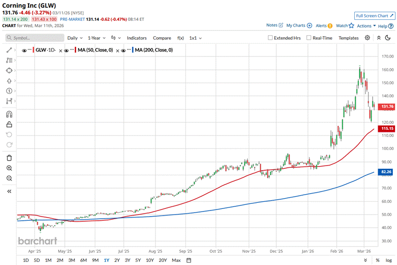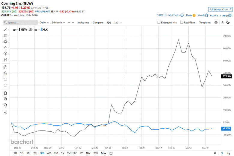 However, the technology stock currently trades 18.7% below its 52-week high of $162.10 recorded on Feb. 25. On the bright side, GLW has gained 37.3% over the past three months, notably outperforming the State Street Technology Select Sector SPDR ETF’s (XLK) 5.1% decline during the same time frame.