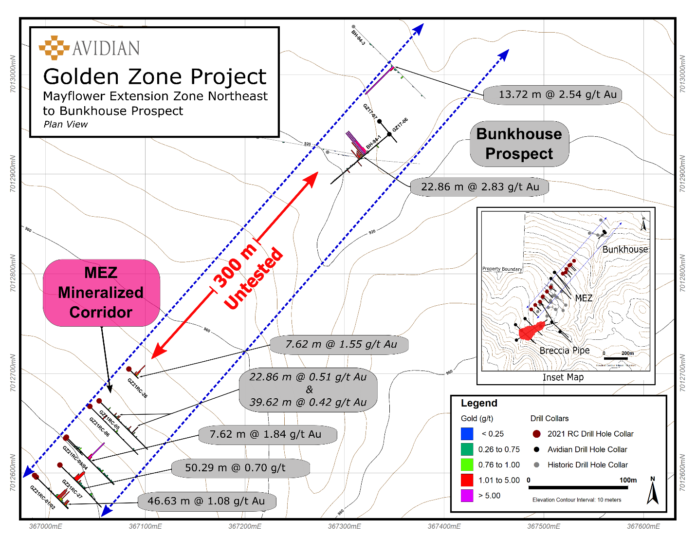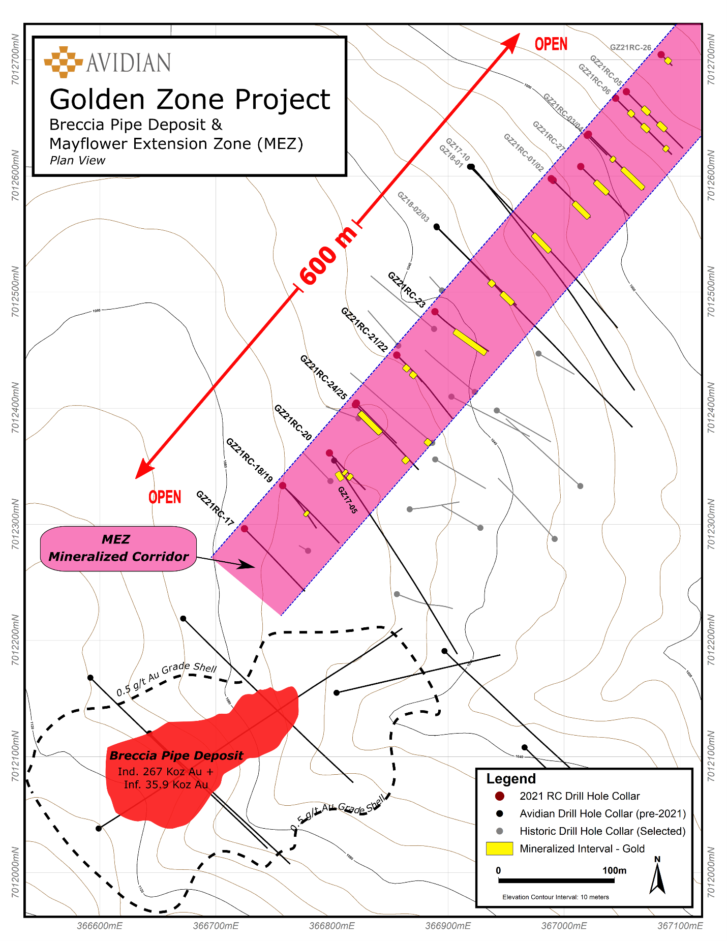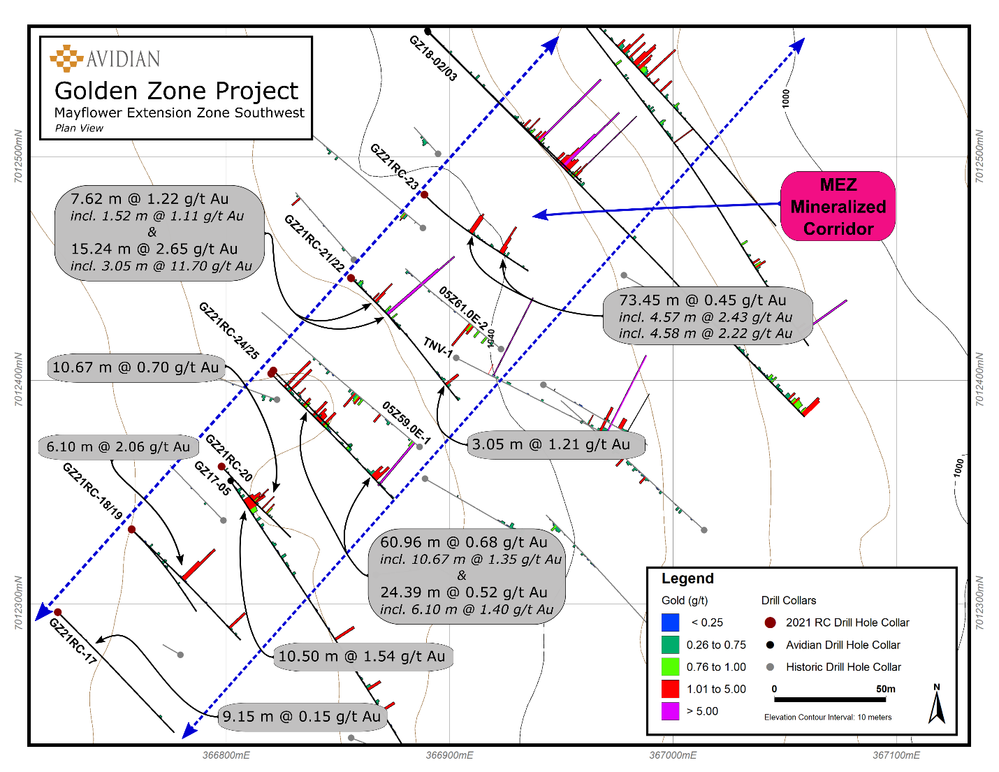 TORONTO, ON / ACCESSWIRE / February 1, 2022 / Avidian Gold Corp. ("Avidian" or the "Company") (TSX-V:AVG & OTCQB:AVGDF) is pleased to provide assay results from the remaining 9 of the 17 reverse-circulation ("RC") drill holes completed on the southwest portion of the Mayflower Extension Zone ("MEZ") (Figure 1 & 2). Assay results from the 9 holes reported in this press release along with the previous 8 holes announced (see Press Release dated January 19, 2022) complete the reporting of all 17 RC holes that drill tested a 600 m portion of the MEZ in 2021.