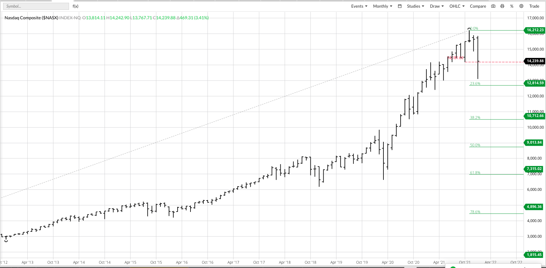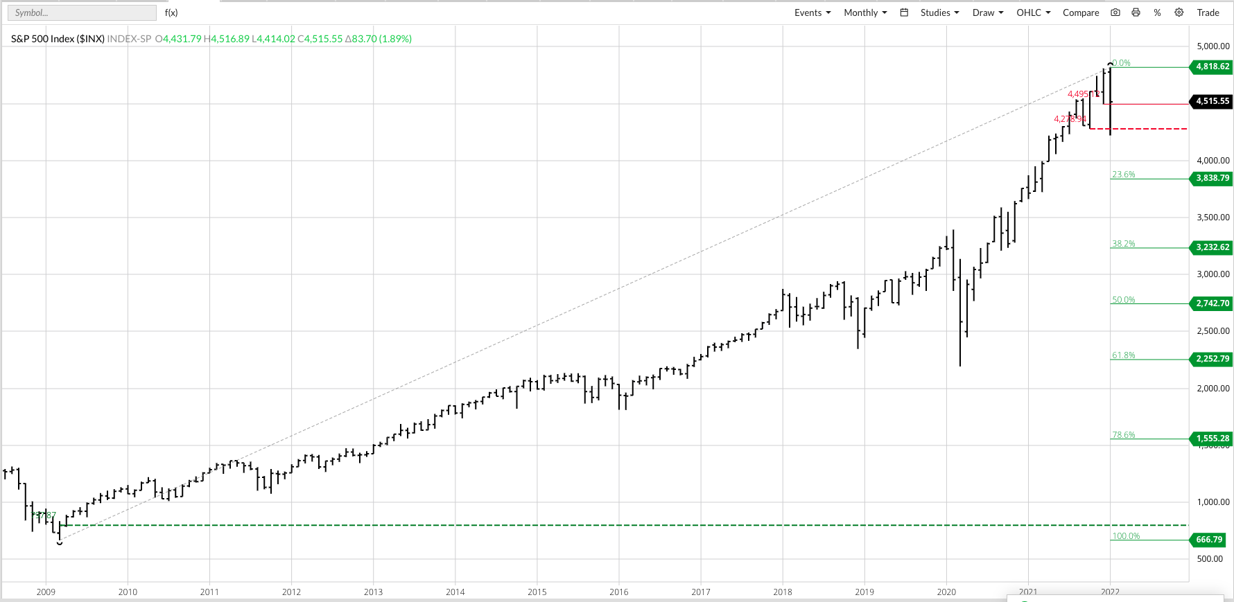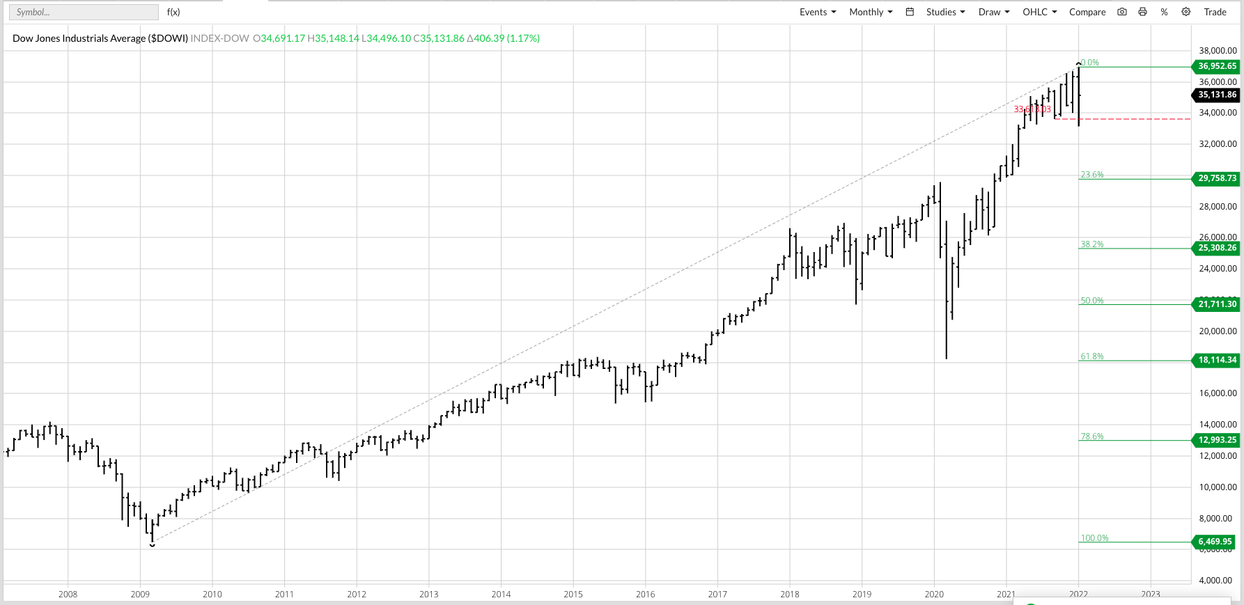 The monthly chart for the Dow shows us much the same thing as the $DOW posted a new high of 36,952.65 during January before taking out the previous 4-month low of 33,613.03. If we the simplest form of technical analysis, that being Dow Theory, we would expect a 33% selloff following the January reversal. But nothing in analysis is absolutely clear, with some (like me) using the starting point back at the low of 6,469.95 from March 2009 while others would argue the most recent uptrend started with the March 2020 low of 18,213.65. For now, I’m keeping an asterisk by that move. With that in mind, a 33% break puts a target near 26,790.00.