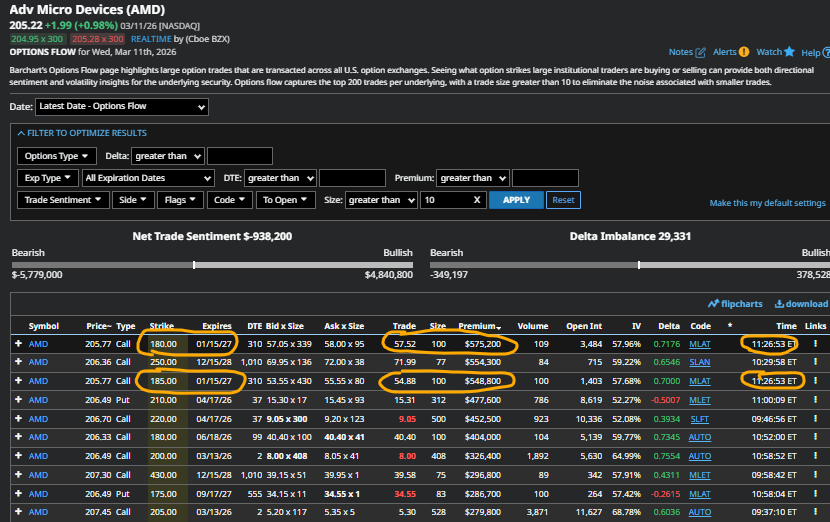 Reviewing Advanced Micro’s Options Flow from the vantage point of highest dollar transactions, two of the largest trades combined into a long-term, modestly in-the-money January 2027 bull call spread.