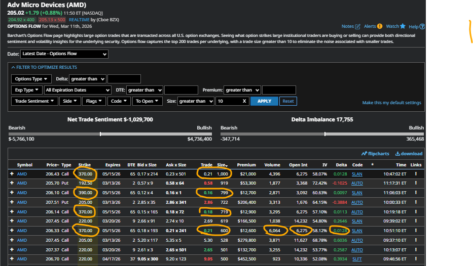 During Wednesday’s first half of trade and after sorting AMD’s Options Flow page for larger activity based on contract size, the May $370 and $390 calls stuck out with a handful of purchases ranging from 600 to 1,000 contracts.