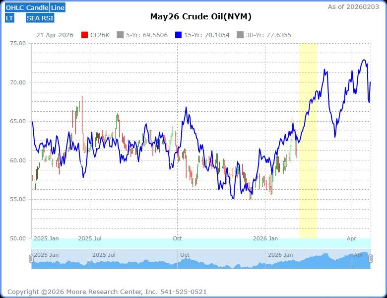 For this seasonal buy window, MRCI has found that the May crude oil contract has closed higher on February 24 than on approximately February 06 in 13 of the past 15 years, for an 87% occurrence. During this hypothetical testing period, the average profit per standard contract for crude oil (1,000 barrels) was $2.26 per barrel, or $2,257.