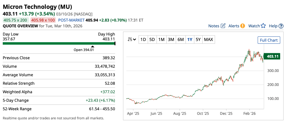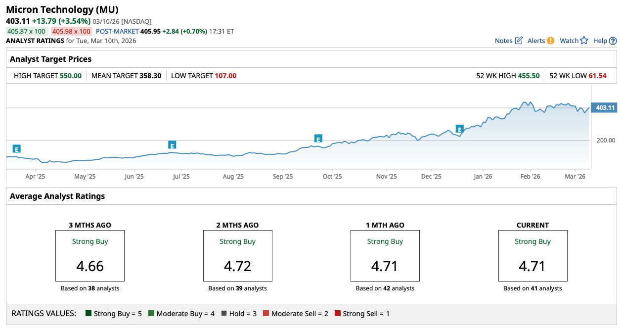 The interesting news for investors looking at Micron today is that Wall Street analysts do appear to be behind the curve on this particular name. With a current consensus price target of a little under $360 per share, there's currently around 10% downside baked into MU stock, taking this price target at face value.
