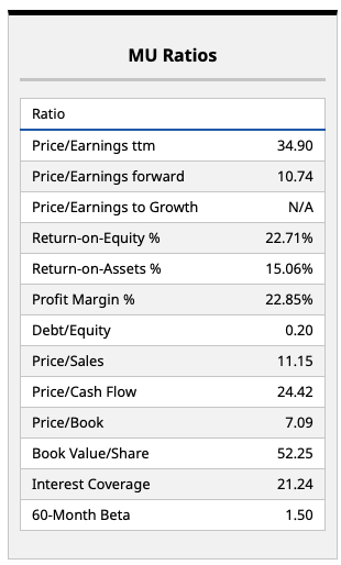 Personally, I'm paying closer attention to Micron's other key ratios, such as its return on equity and return on assets, both of which are well into the double-digits. Those signify this is a company with a solid operating model and significant cash flow, which can fund further growth as Micron reinvests in its core business.